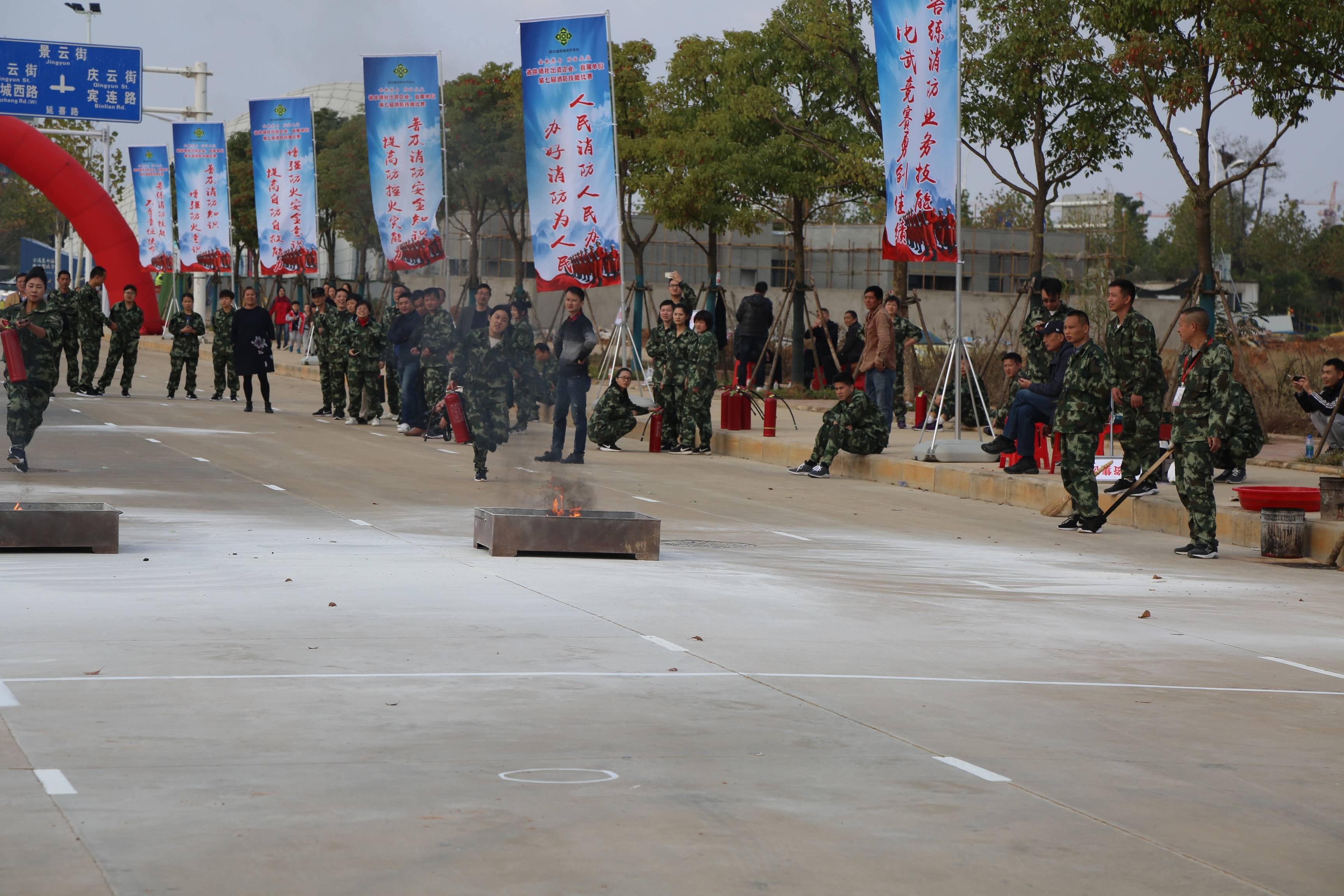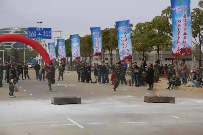 角逐最后一项“干粉灭火器灭油槽”有着奔驰距离最长的赛道。放眼望去,各个参赛队中都有身高腿长占优势的强大敌手,竞争异常猛烈。但集团公司的张航、尹杨晶两位队员不畏强手,在角逐中展现了集团公司的自信与实力。只见尹杨晶若离弦之箭奔驰到消防器材点,疾速捞起灭火器迅速扑灭起火点,行动连贯、一气呵成,似一股旋风冲向跑道的尽头。